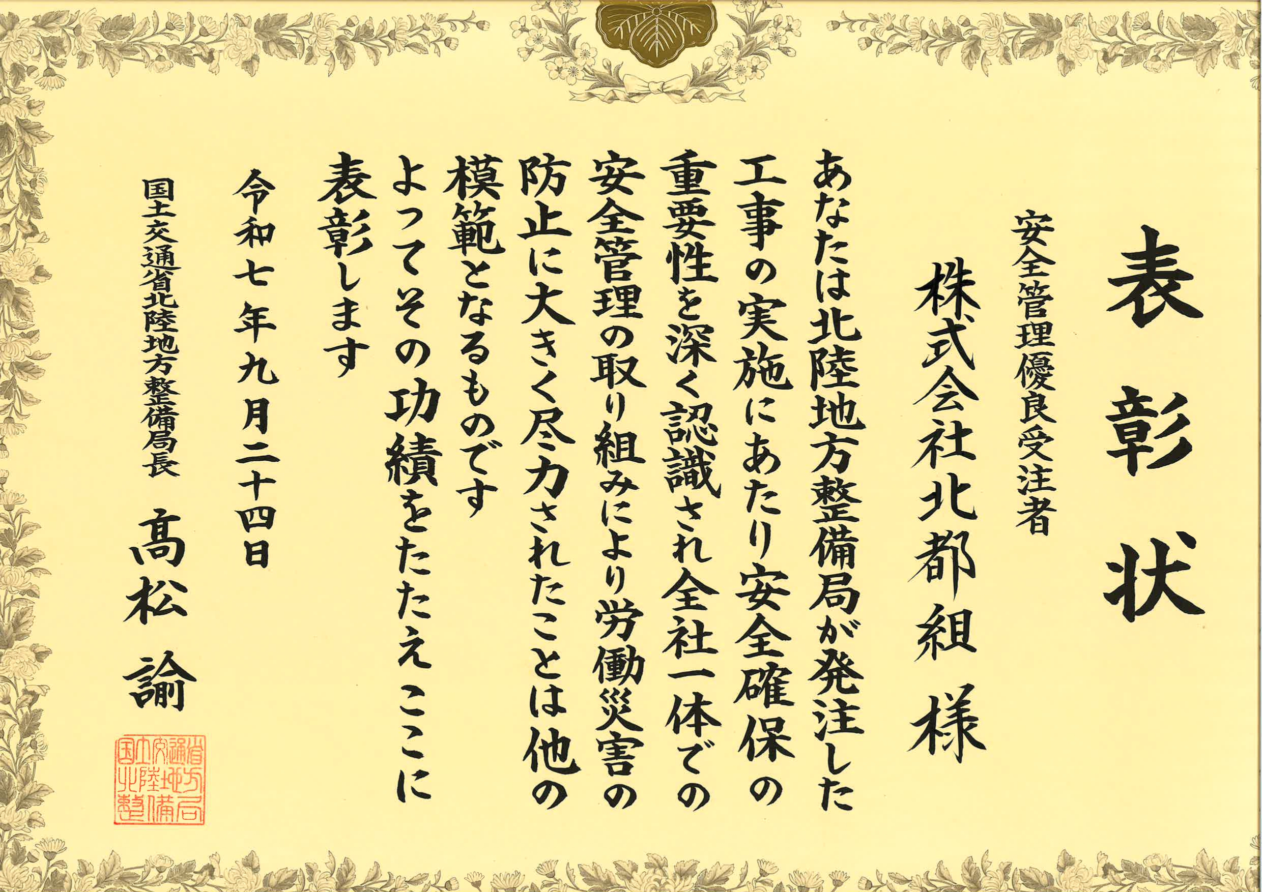 北陸地方整備局 | 安全管理優良受注者 工事の安全確保の重要性を深く認識し、 全社一体で安全管理の取り組みにより労働災害の防止に大きく尽力 |